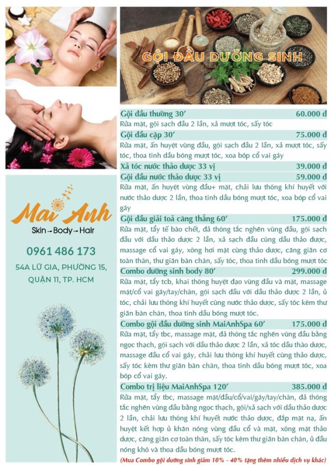 - Gội đầu dưỡng sinh:là chăm sóc tóc và da đầu một cách đặc biệt, kết hợp với việc massage vùng đầu, vai gáy, cổ, lưng,…làm sạch da đầu và tóc với các dầu gội thảo dược từ thiên nhiên như sả, bồ kết, vỏ bưởi, quế,…
